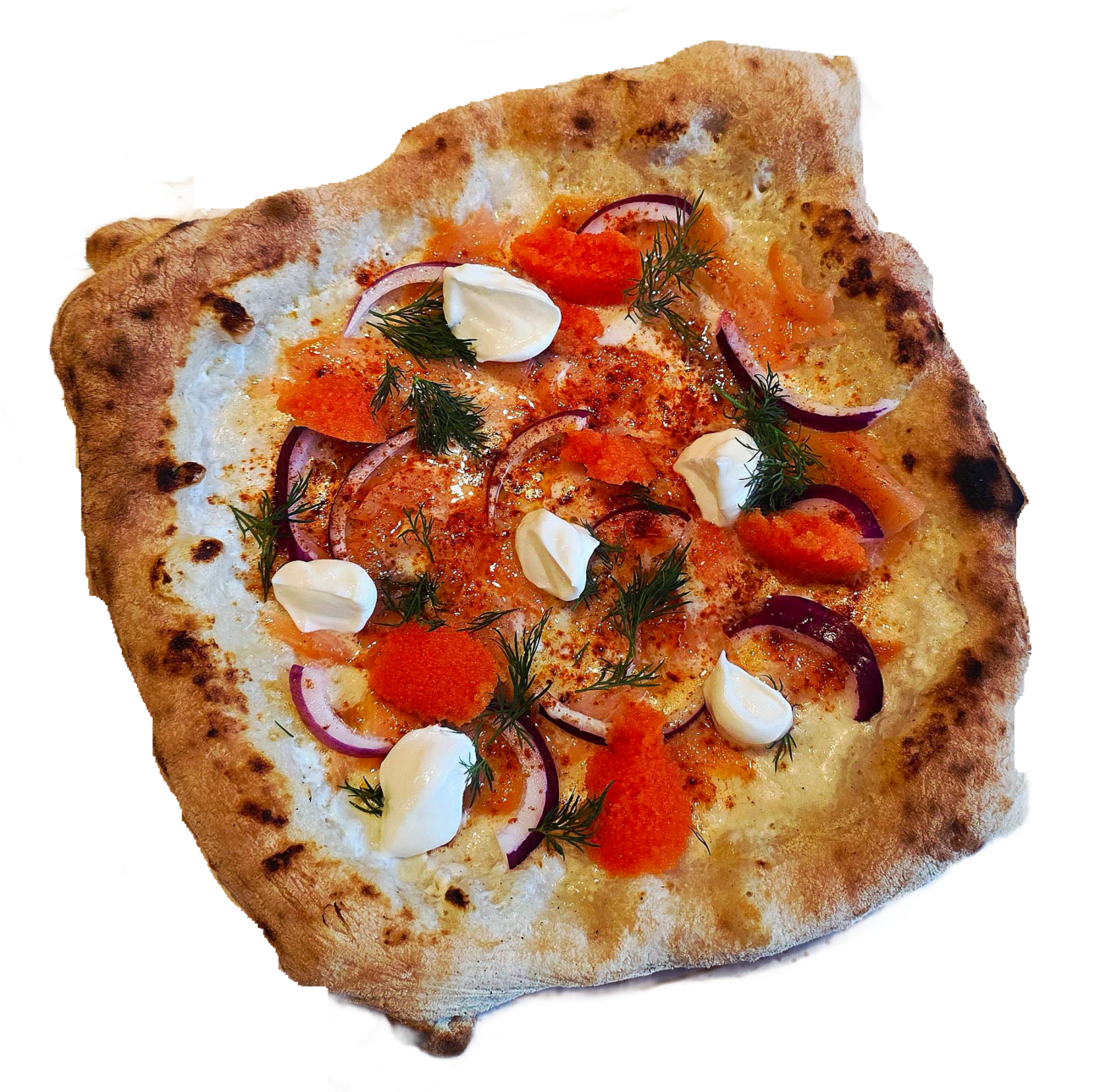 Crème fraiche, mozzarella di Bufala, västerbottenost, kallrökt lax, löjrom, rödlök, citronsaft, rökt paprikakrydda, dill